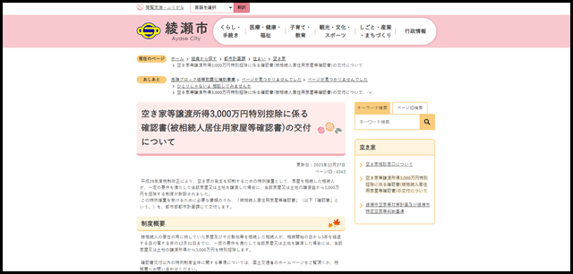 平成28年度の税制改正に伴い、相続した家屋や土地を譲渡する際、特定の要件を満たした場合に最大3,000万円の特別控除が適用される制度。この特別控除を受けるためには、「被相続人居住用家屋等確認書」の提出が必要で、綾瀬市都市部都市計画課で交付されます。